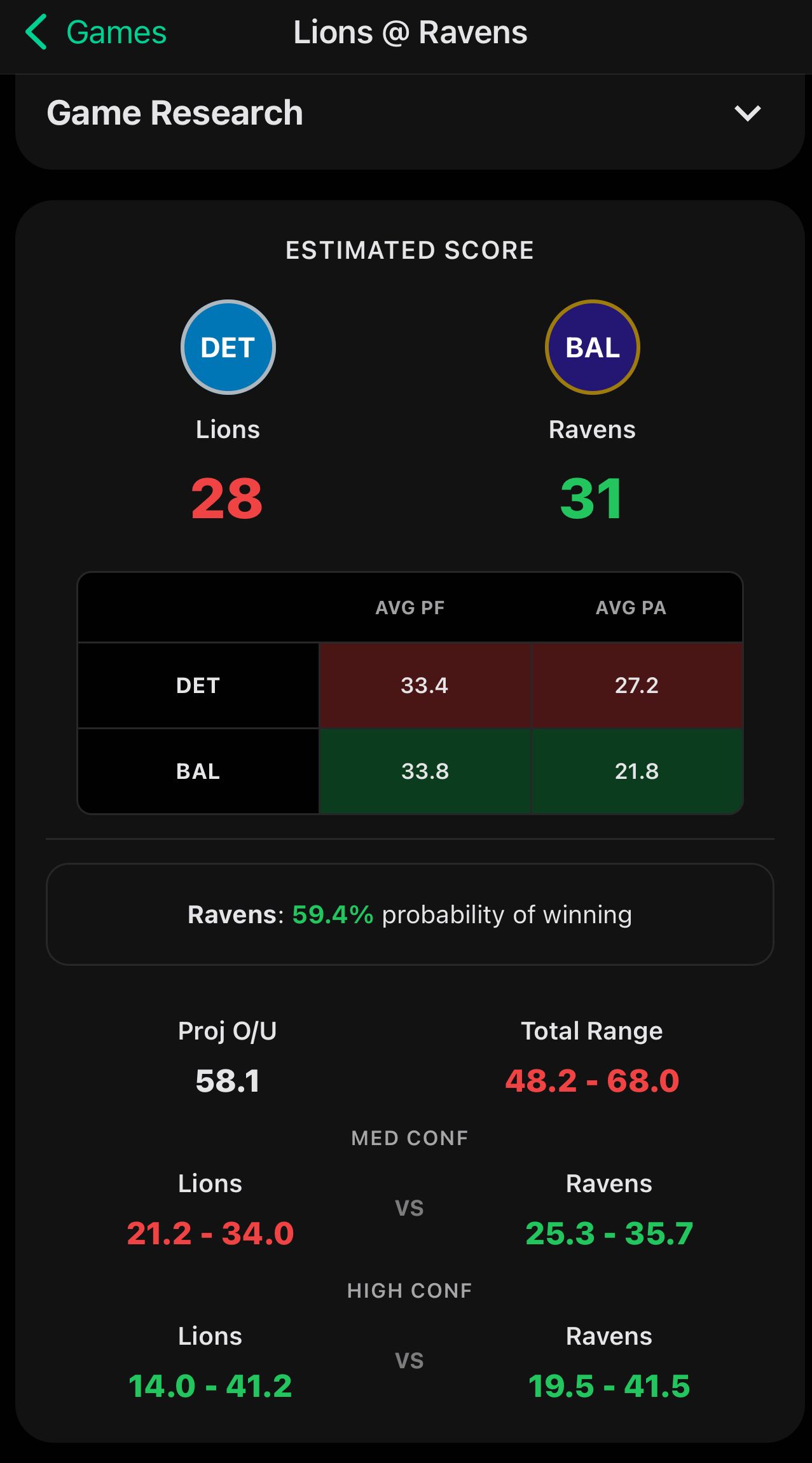 For example, Detroit vs Baltimore last night, O/U was 51.5 - we projected 58, the final total was 68 and we got another winner.
