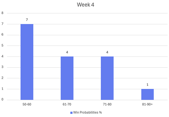 There we have it, Week 4 we have another 7 Games with win probabilities between 50-60%, what does that mean? Tread lightly with those games, look at the value of the underdogs given the probabilities game by game.