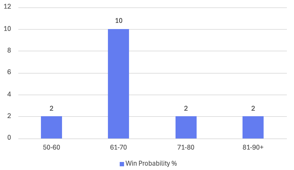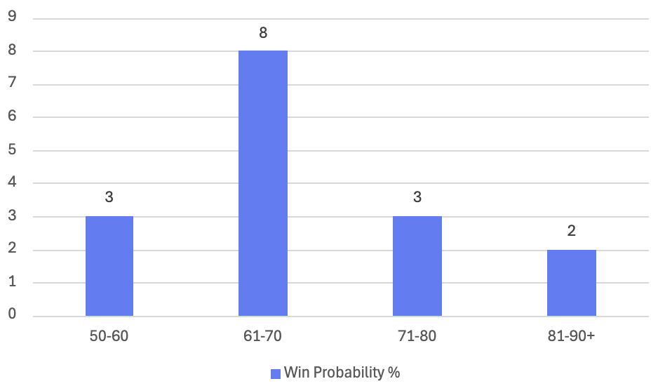 Out of the 16 games, only 9 games had a team with a win probability of 60% or higher. Lets break down how these turned out.