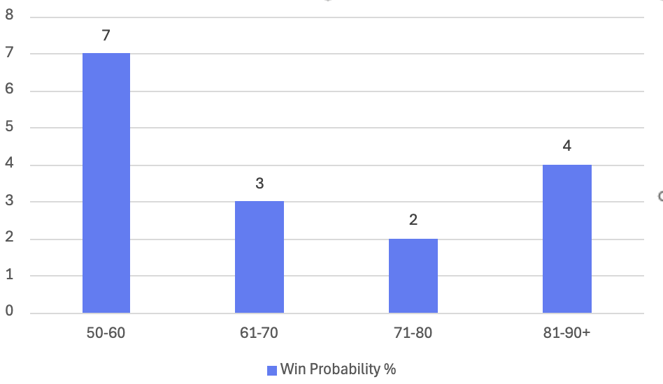 The main difference between Weeks 1 & 2? The number of games with 50-60% Win Probabilities, only 5 in total those weeks. Week 3? We had 7. From those 7 games, 6 predictions, 4 losses, 2 wins, 1 omission.